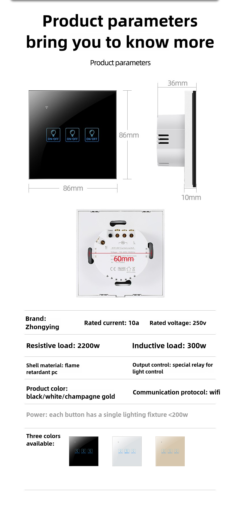 产品材质:钢化玻璃面板+防火PC外壳